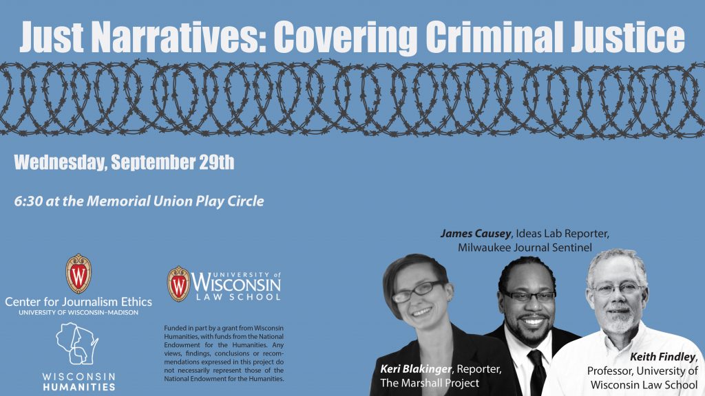 Madison, Wisconsin – The Center for Journalism Ethics will host a public event – “Just Narratives: Covering Criminal Justice” – at 6:30 p.m. Wednesday, Sept. 29, at the Memorial Union Play Circle on the UW–Madison campus. Three panelists with expertise in criminal justice and journalism will engage in a public discussion about media ethics and the challenges of covering the justice system in the U.S.
