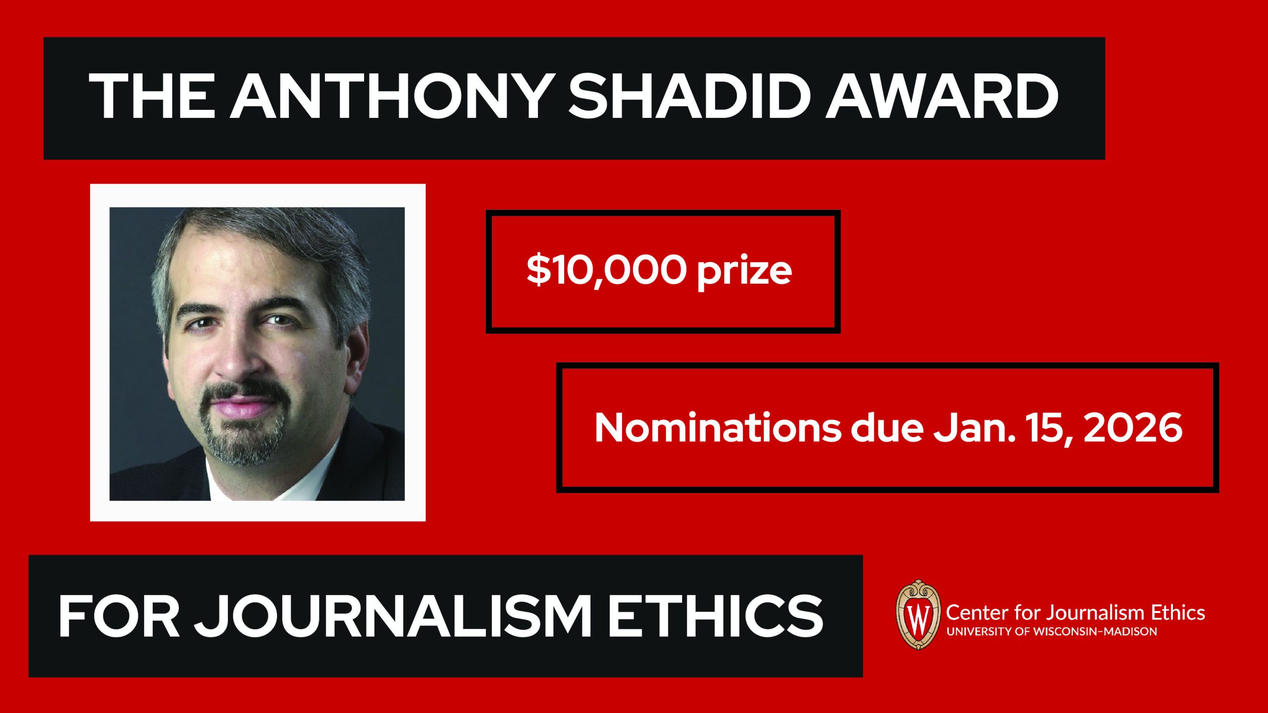 The Center for Journalism Ethics at the University of Wisconsin-Madison seeks nominations for the Anthony Shadid Award for Journalism Ethics. Now in its 17th year, the Shadid Award recognizes ethical decisions in reporting stories in any medium, including print, broadcast and digital, by journalists working for established news organizations or publishing independently. Work must have been published or aired in 2025.